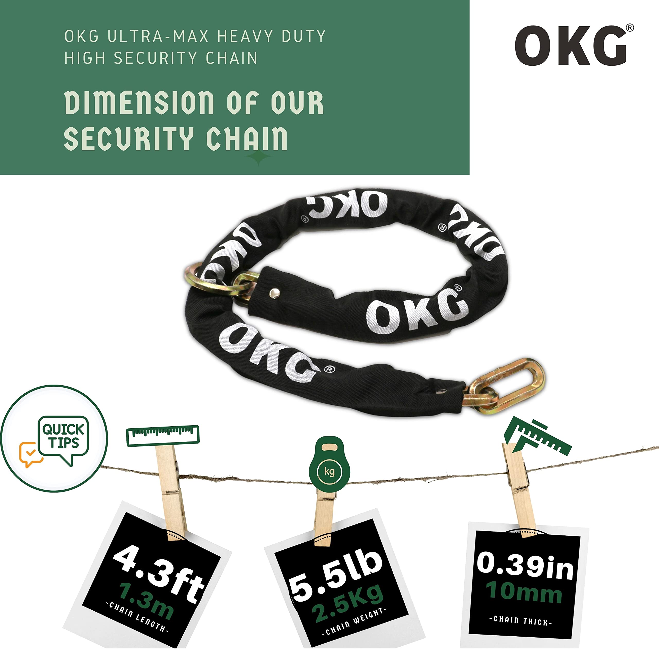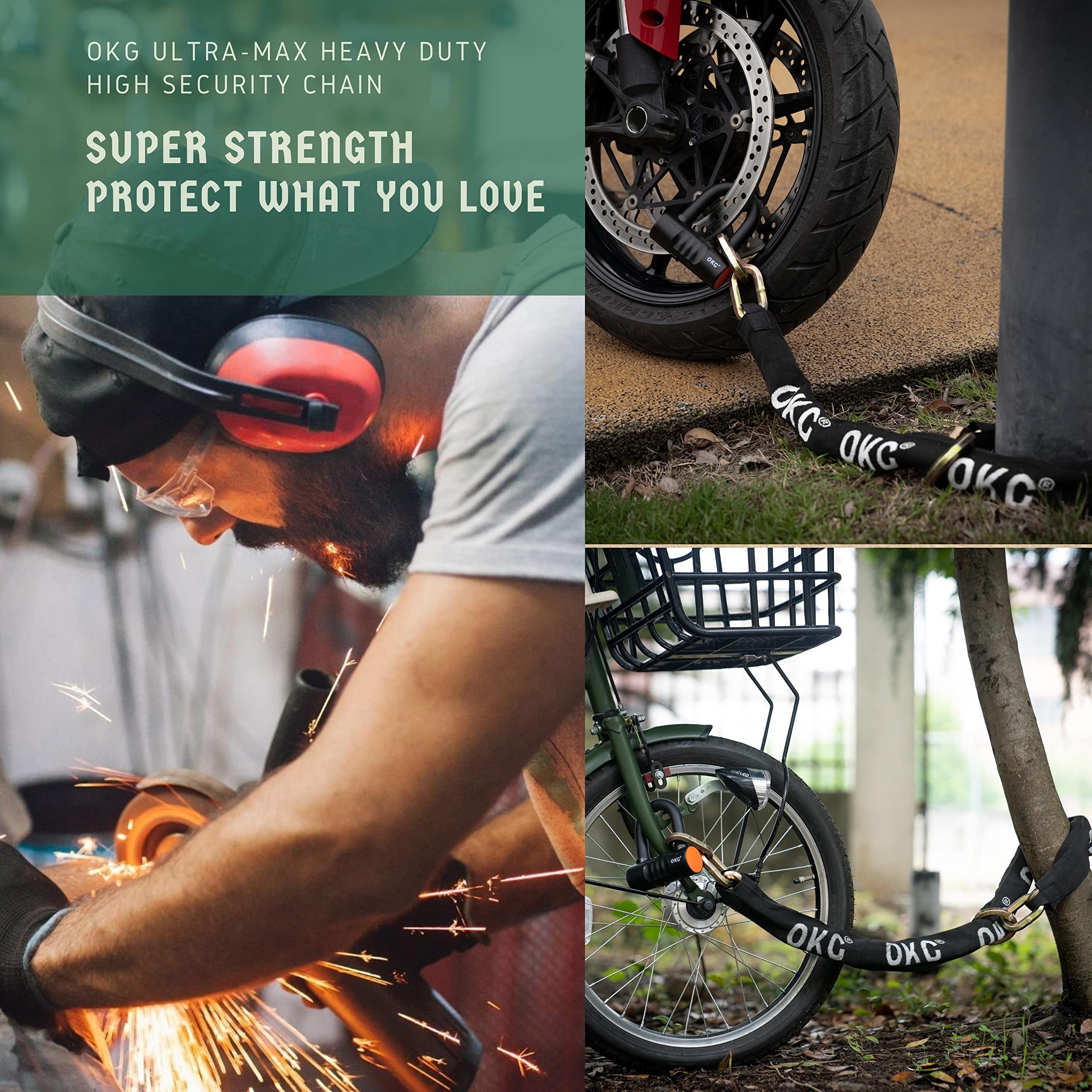 - ✓ SPECIAL O-RING NOOSE LOCK CHAIN DESIGN – OKG HEXAGONAL WARRIOR ultra security chain is different from the normal square steel chain or round cut proof chain, O-ring design at the end can doubles the effective working length. Multifunction security locking method can maximize the value of anti-theft chain link.