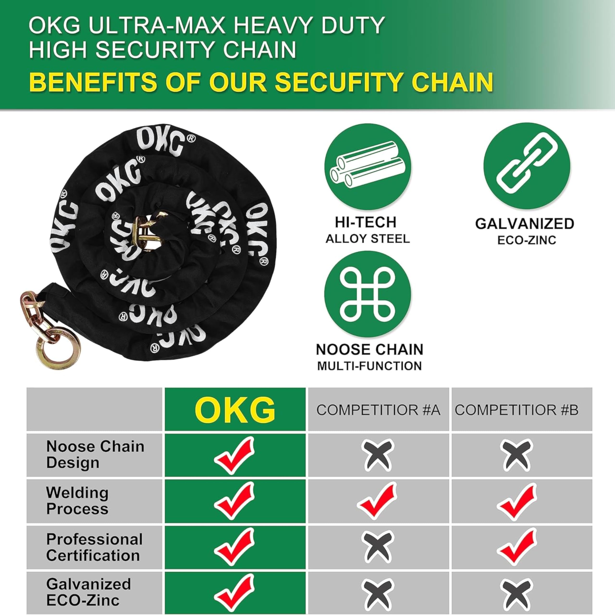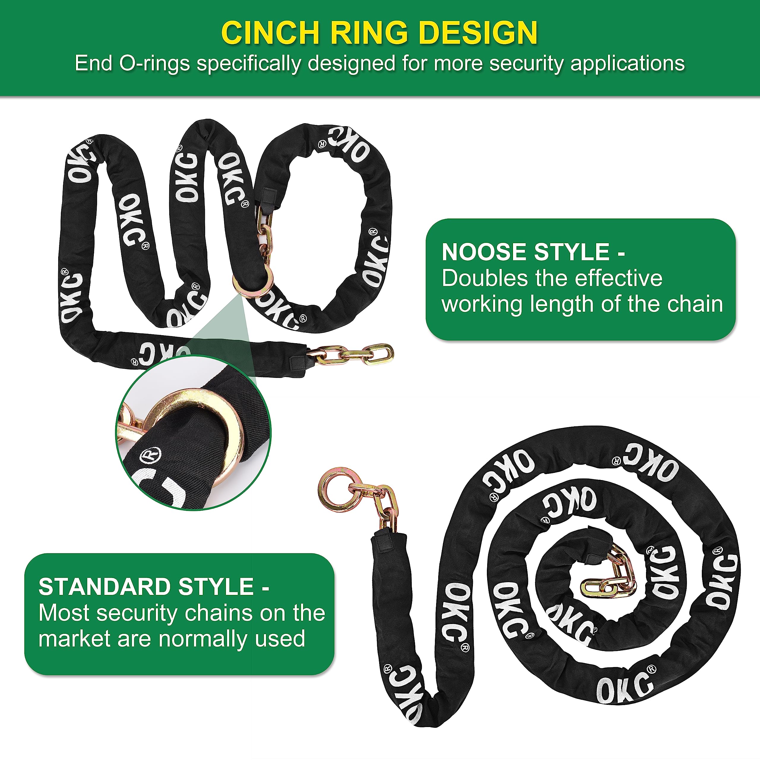 - ✓ SPECIAL O-RING NOOSE CHAIN DESIGN – OKG ultra security square chain is different from the round cut proof chain or normal security chain, Cinch ring design at the end can doubles the effective working length. Multifunction security locking method can maximize the value of anti theft security chain and be used for various security applications.