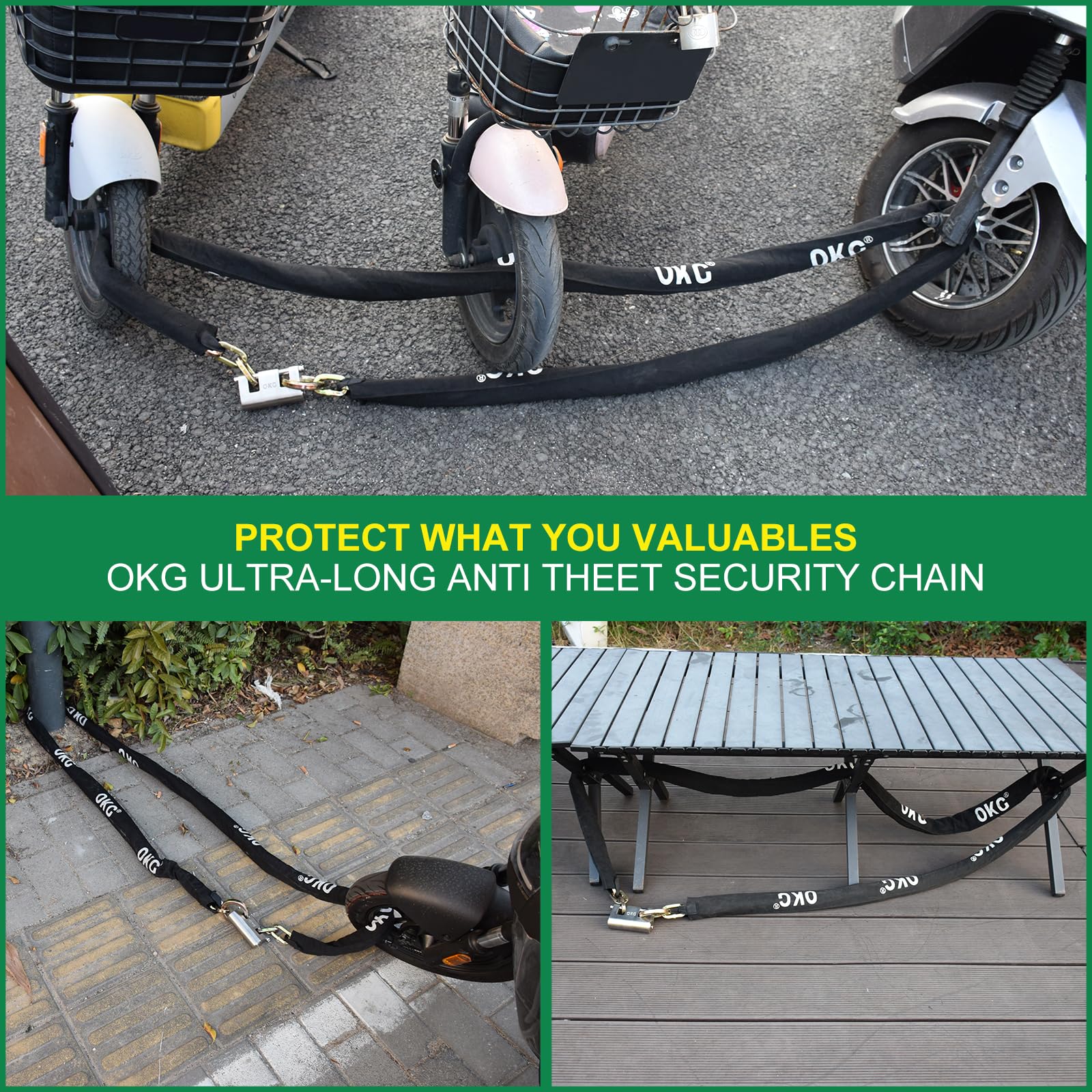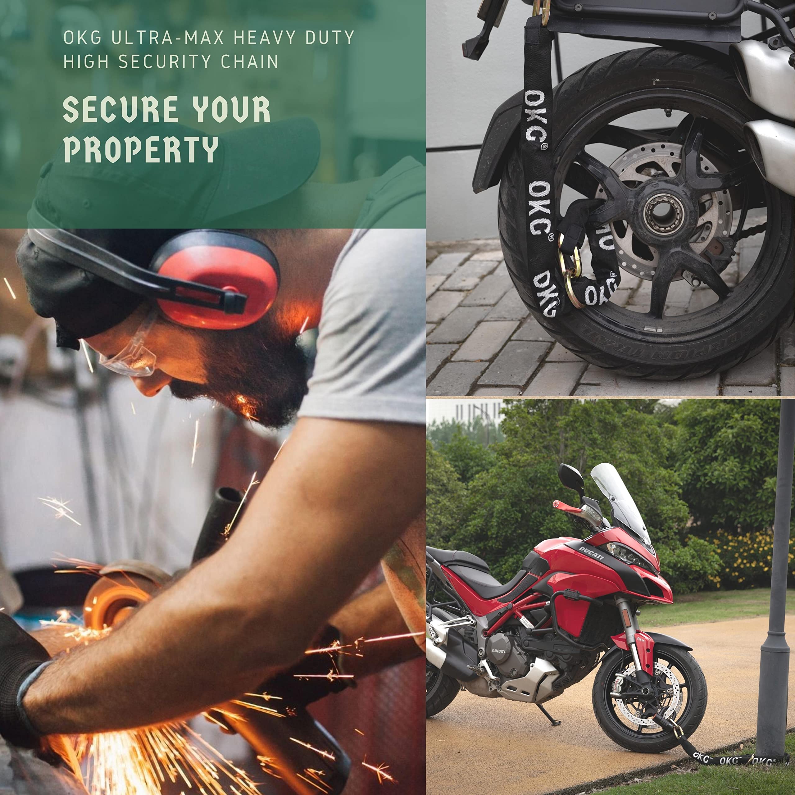 - ✓ MULTIPLE USES TO PROTECT PROPERTY – Industrial and consumer users use OKG security heavy duty alloy chain, large volume sales exhibit prove that it can protect your property well. OKG premium anti theft chain can be used as a motorcycle chain lock, bike chain locks, and Used with matching locks. it can be used in containers, scooters, ATVs, generators, fence gates, golf carts, and more