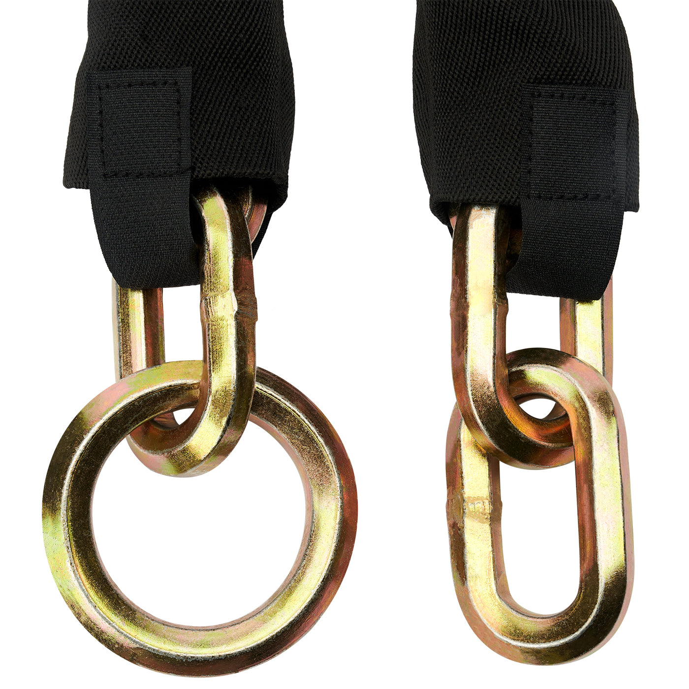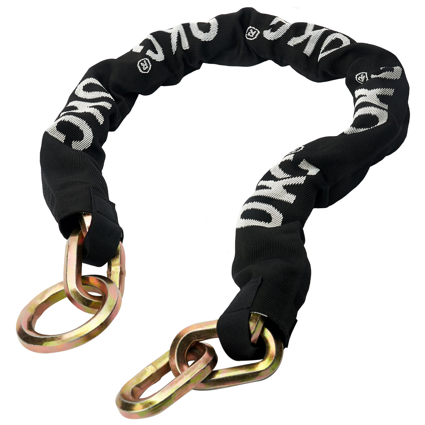 Our security chains are made of triple heat-treated boron MANGANESE STEEL with a special anti-corrosion coating which makes them ideal for outdoor use. The links are not round like on common chains, but are hexagonal shaped which is a lot more effective against attacks with tools. The chains also feature a nylon sleeve to prevent paint work and chrome from scratches and damage.