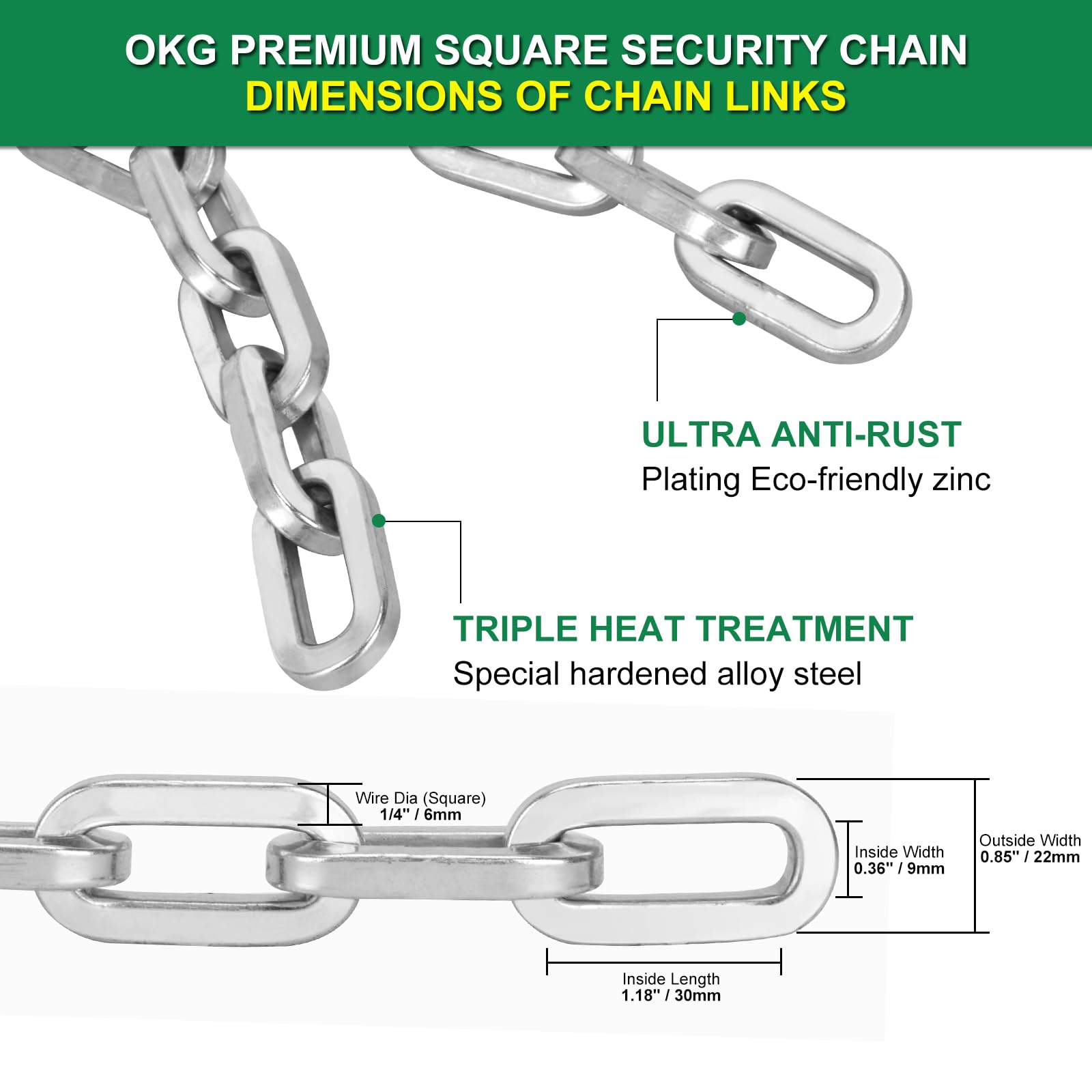 - ✓ UNBREAKABLE STRENGTH: The OKG Security Gate Chain is made of hardened HI-TECH alloy steel with a length of 2 feet. It has a maximum tensile force of 26kN and a maximum cut force of 29kN, making it difficult to cut. The chain’s surface hardness is 60HRC, and has an Eco-zinc plating coating for rust and corrosion resistance.