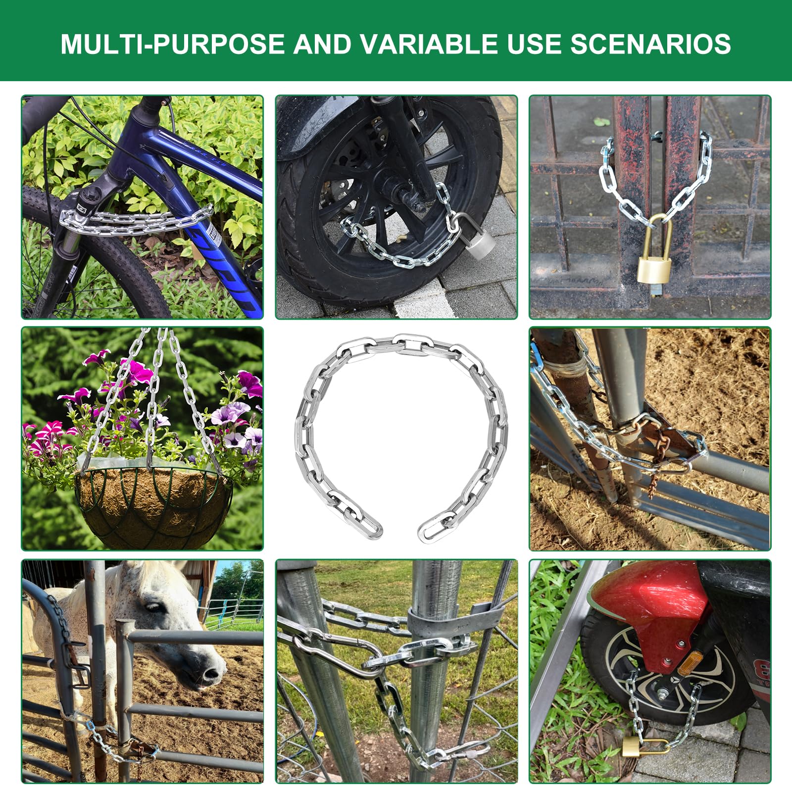 - ✓ WIDE APPLICATION: The short gate chain can be used for various purposes, such as outdoor fences, stables, garden gates, and pet cages to prevent your cows, horses, sheep, dogs, and cats from escaping. It is also ideal for hanging hammock chairs, chandeliers, planters, feeding hangers, punching bags, aerial yoga, suspension straps, resistance trainers, and hammock swing kits.